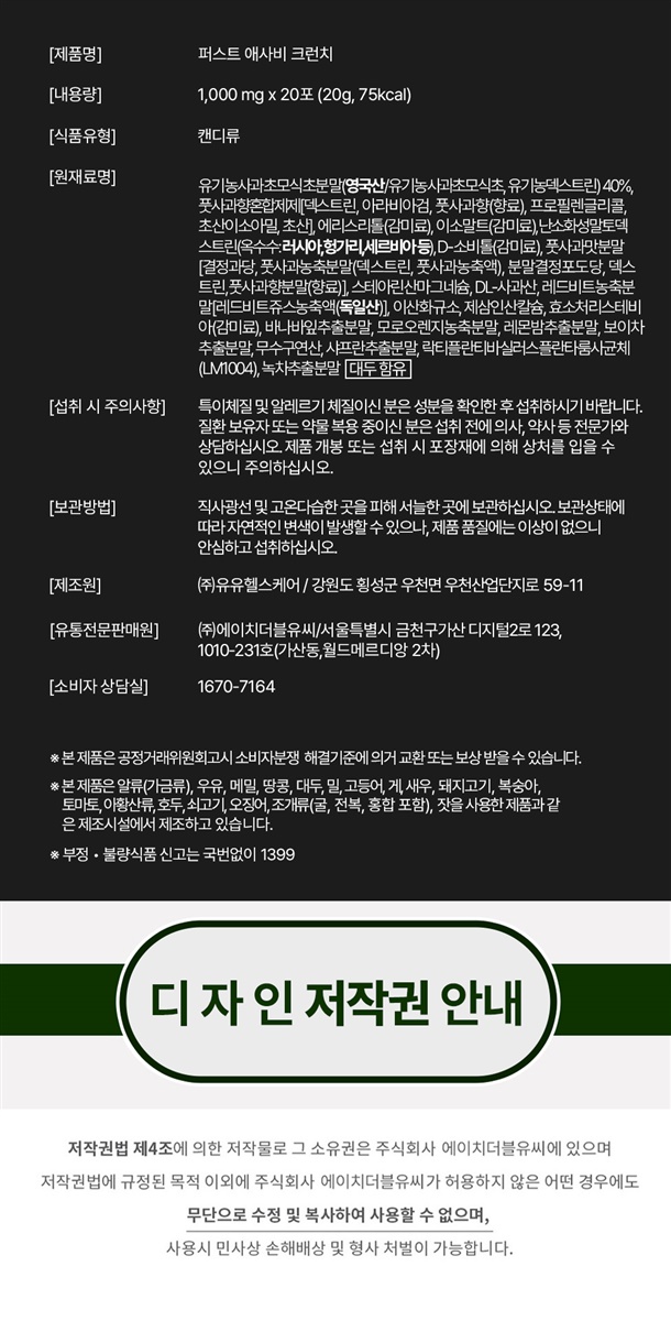 | 1-6. 원재료명 (「농수산물의 원산지 표시 등에 관한 법률」에 따른 원산지 표시 포함) 및 함량(원재료 함량 표시대상 식품에 한함) | 상품 상세정보 참조 |